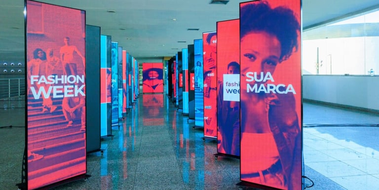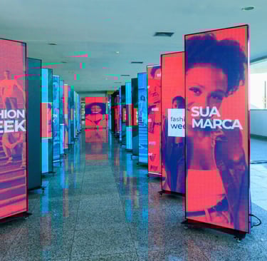 As telas exibem anúncios de outras empresas, além de conteúdos institucionais ou informativos do próprio estabelecimento.